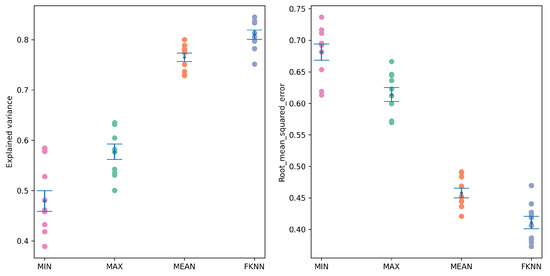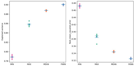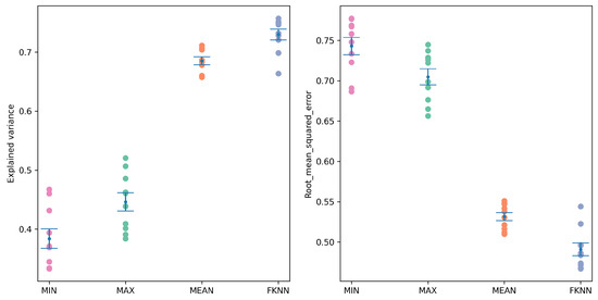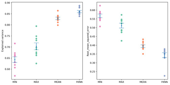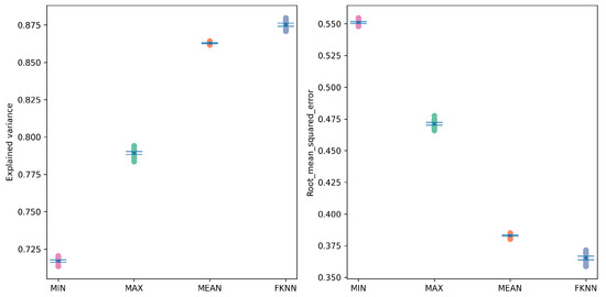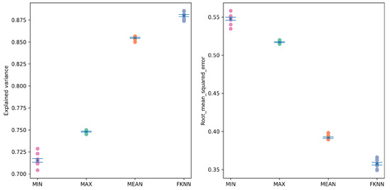 In the Figure 12, Figure 13 and Figure 14, the left side comprises box plots illustrating explained variance, while the right side depicts box plots for RMSE. The upper and lower edges of the box represent the middle 50% range of the ten dots, with the midpoint indicating the mean. Additionally, dots are plotted and methods are distinguished by different colors. It can be observed that FKNN exhibits optimal and significant mean performance. However, the performance gap between the MEAN method and the FKNN method is relatively small. The reasons are as follows.