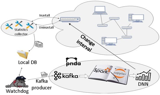 To evaluate the proposed solution, a series of experiments were conducted using the Mininet environment. The routing mechanism, traffic statistics retrieval, and switch polling interval modification were implemented as a module in the Ryu controller [28]. Collected traffic statistics were sent by a custom Python script (referred to as “watchdog”) to the Red PNDA environment [8] (Figure 2).