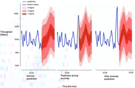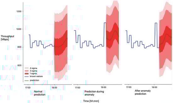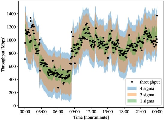 A closer examination of the predicted sigma interval, as portrayed in Figure 4, provides insights into the neural network’s accuracy with varying data collection intervals. Notably, longer intervals yielded a more accurate representation of the network’s expected behavior. Despite a conspicuous deviation at the beginning and end of the day, the overall trend indicated greater fidelity to the anticipated distribution. The inherent smoothing effect associated with longer intervals resulted in a more consistent throughput characteristic throughout the day.