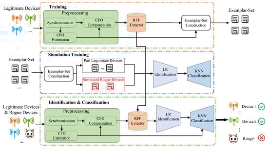 Simulated Training: During the simulated training stage, we utilize the exemplar set to train an RFF classifier. After the training process, we split the exemplar set into two parts, one part for legitimate devices and the other part for simulating rogue devices. Some data from the legitimate devices part are used to fit the K-nearest neighbors (KNN) model. Then, the KNN model predicts the labels of the remaining data from the exemplar set. We use the remaining data and labels given by the KNN model to train the logistic regression (LR) model. During the device identification stage, the KNN model is mainly responsible for the legitimate device classification function, while the LR model is responsible for the rogue device detection function.