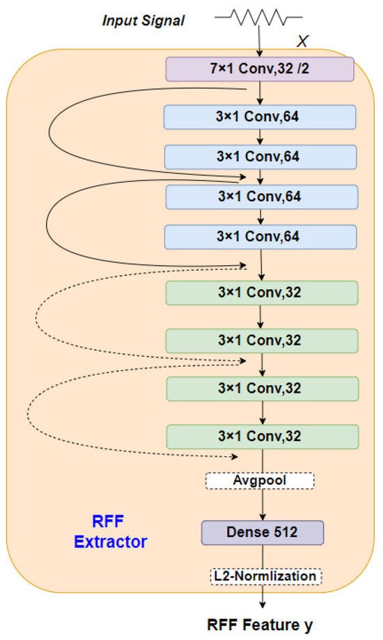 The architecture of our RFF extractor, illustrated in Figure 2, is based on a residual neural network (ResNet) structure with cross-layer connections. This architecture consists of nine convolution layers, one average pooling layer, and one dense layer with 512 neurons. The RFF extractor takes a 1024-dimensional vector uniformly sampled from the preprocessed LoRa signal as input. The first convolution layer comprises 32 filters with a size of 7 × 1 and a stride of 2. Subsequent convolution layers (the second to fifth) consist of 64 filters with a size of 3 × 1. The sixth to ninth convolution layers employ 32 filters with the same size as the previous layers. To capture non-linear relationships, all the convolutional layers are activated using rectified linear units (ReLU). Additionally, the strategic use of padding in convolutional layers preserves the spatial information of the input signal, preventing the loss of crucial features. The output of the last convolutional layer undergoes average pooling before being fed into the dense layer. The L2 normalized model produces a 512-dimensional vector, representing the RFF features extracted from the received packets.