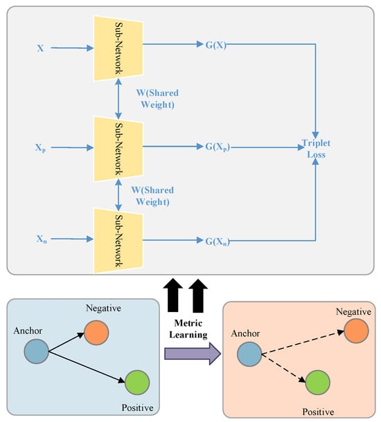 where is norm, which denotes the Euclidean distance between two vectors. is a parameter in the loss function, which denotes the margin between the positive and negative pairs. By leveraging deep metric learning based on triplet loss, as shown in Figure 3, the feature embedding distances between the anchor and the negative sample are larger, while the distances between the anchor and the positive sample are smaller.