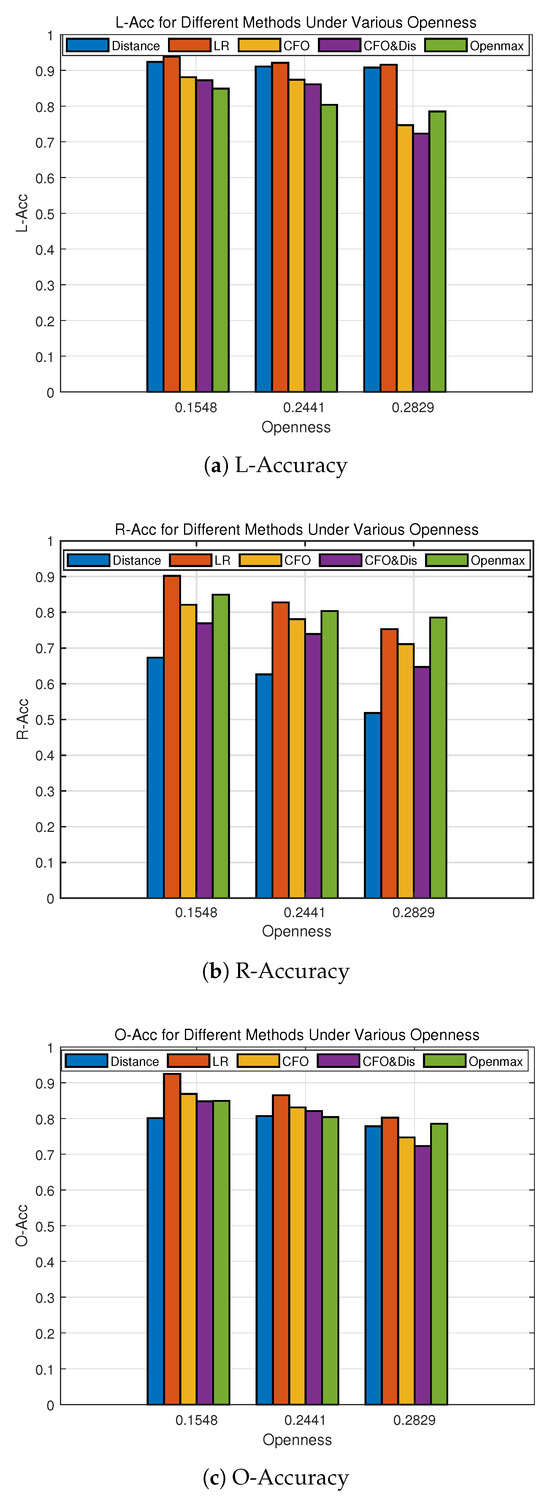 The device verification results shown in Table 2 highlight the effectiveness of the strategy of the two parts of the task separately across different openness levels. At a low openness level (0.1548), LR outperforms the other methods, achieving a high legitimate classification accuracy (-acc) of 93.8%, a robust rogue detection accuracy (-acc) of 90.2%, and an impressive overall accuracy (-acc) of 92.5%. In comparison, the other methods, such as Openmax, CFO, distance, and CFO plus distance exhibit lower performance metrics. As the openness level increases to 0.2441, LR maintains its superiority with an 86.5% overall accuracy, surpassing alternative methods such as Openmax, CFO, distance, and CFO plus distance. Even at a higher openness level of 0.2829, LR demonstrates robust performance, achieving an 80.2% overall accuracy. This performance consistency across various levels of openness highlights the validity of the effectiveness of our approach in distinguishing between legitimate and rogue devices in open-set scenarios.