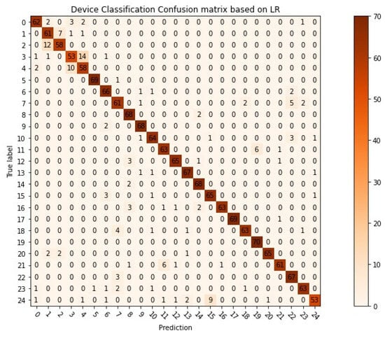 Table 2 shows the effect of using different methods on the confusion matrix, with a focus on the F1-score, recall, precision, and specificity. The LR model achieves the highest F1-score of 0.9080, followed by OpenMax with 0.9022, while the CFO and distance methods have lower F1-scores of 0.8732 and 0.6347, respectively. The LR model also has the highest recall and precision, indicating a better ability to correctly identify both rogue and legitimate devices. Additionally, all methods have high specificity, with LR and OpenMax having values close to 1, indicating a low false positive rate. Overall, the table highlights the effectiveness of the LR model for device authentication, with better performance than the other methods.