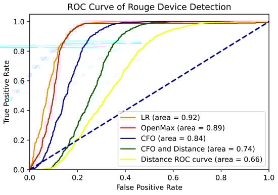 Figure 7 illustrates the ROC curve of the simulated attack detection and the corresponding area under the curve (AUC) values. With an AUC value of 0.92, our LR approach is a notable performer demonstrating its ability to discriminate between rogue and legitimate devices. This performance is much better than that of the threshold-based detection techniques, such as the CFO and distance, and it outperforms the OpenMax method (AUC = 0.89). Remarkably, the LR curve is consistently dominant, confirming its effectiveness in the open-set task of detecting rogue devices.