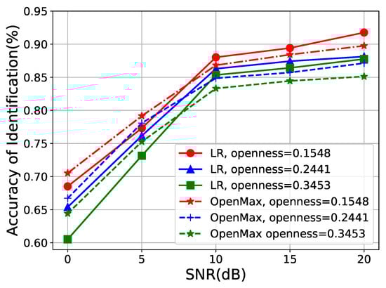 In this section, we describe the experiments conducted to evaluate the performance of our method under varying SNRs. We first train the model using data with relatively high original SNR under various openness. Subsequently, we evaluate the model’s recognition accuracy on multiple test datasets with varying Gaussian white noise levels, ranging from 0 dB to 20 dB. The OpenMax method is employed as a benchmark for comparison.