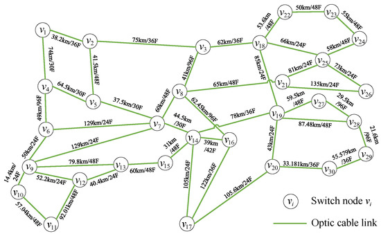 We use the power communication network in certain areas of Shandong Province, China, for experimental simulation to study the route planning scheme. The topology diagram of the communication network is shown in Figure 4, which includes 30 switching nodes and 45 fiber optic links. The link length and number of fiber cores are indicated on the link segments. For example, the optical cable between node and node is 38.2 km, with 36 fiber cores. In practice, the bandwidth capacity of fiber optic cable links is directly proportional to the number of fiber cores. For the convenience of the experiment, we will set the bandwidth of the optical cable link in proportion to the actual number of fiber cores.