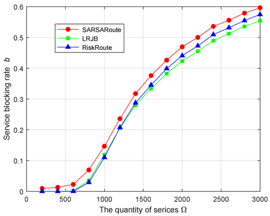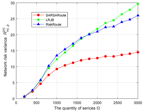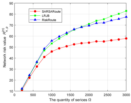For the network risk value , we know that the importance of the relay protection service is the highest, and the corresponding risk value is relatively high. Compared to the other two schemes, the SARSARoute route planning scheme considers the overload constraint of relay protection services, and some relay protection services are blocked. In addition, the LRJB scheme does not consider node risk. Therefore, the network risk value of the SARSARoute route planning scheme is minimized. For the network risk variance , the SARSARoute route planning scheme obtains the route with the smallest network risk variance through trial and error. But the LRJB scheme considers the load balance and risk balance of the link, without considering the risk of nodes. The purpose of the RiskRoute scheme is to find the route with the lowest risk, rather than the route that minimizes the network risk variance. Therefore, the network risk variance of the SARSARoute route planning scheme is minimized.