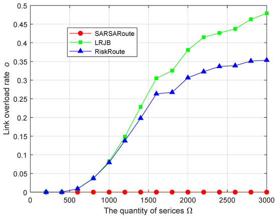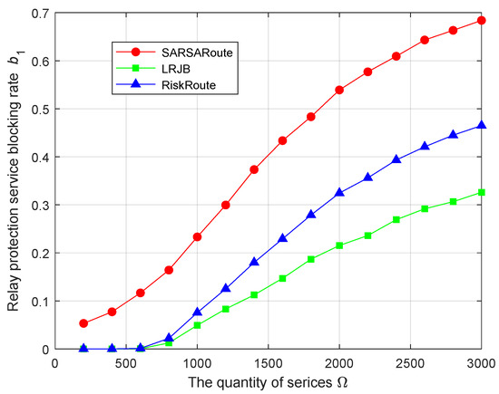 Figure 5 and Figure 6 show the comparison between the service blocking rate b and the relay protection service blocking rate for various schemes under different quantities of services . Figure 7 compares the link overload rate o for various schemes under different quantities of services . From Figure 5 and Figure 6, it can be seen that both the service blocking rate b and the relay protection service blocking rate gradually increase with the increase in the number of services , and the service blocking rate b and relay protection service blocking rate of the SARSARoute route planning scheme are higher than the other two schemes. From Figure 7, it can be seen that the link overload rate o of the SARSARoute route planning scheme has always been 0, meaning no links experience relay protection service overload, while the link overload rate o of the other two schemes will gradually increase with the increase in service number . The reasons are as follows.