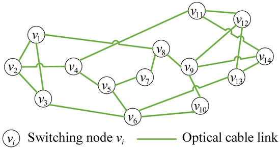 The power communication network consists of N switching nodes and M fiber optic links, which can be represented as . Among them, , represents the set of switching nodes, and E represents the set of optical cable links. The connectivity of switching nodes can be represented by the adjacency matrix . If there is an optical cable link between node and node , then the element ; otherwise, . Therefore, the adjacency matrix is a symmetric matrix, and and represent the same optical cable link. We define the fiber optic cable link as to avoid duplication and meet . Therefore, the fiber optic cable link set has M elements.