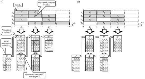 - In the variant from Figure 1b, compared to the variant from Figure 1a, there is a higher rotation of tasks (another assignment causes a smaller decrease in competences in the structure after the implementation of project ), which allows project to be completed within 1 time unit. Ultimately, the project order ends after 3 time units.