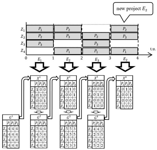 The adopted allocation of employees determines the schedule for the implementation of projects . It is defined as the sequence , where specifies the start point of the project. For simplicity, it is assumed that all project tasks start at the moment of . The start time of the project must not be less than the end time of the project (for ).