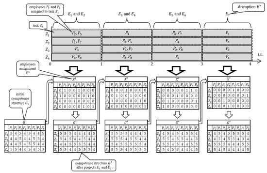 However, the SPSP solutions found in the literature do not take into account unplanned events during the implementation of projects, e.g., additional orders. So, let us consider a case in which a company executes an order according to schedule (see Figure 1b) and considers the possibility of accepting another order . Therefore, the following question arises: is it possible to undertake the implementation of the project and complete the projects (in the order of ) within the deadline of 4 time units for the adopted allocation (determining schedule from Figure 1b)? As can be seen from Figure 2, the competency structure allows for such an allocation of that results in a schedule that is completed on time.