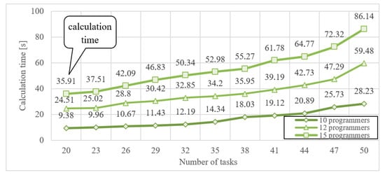 The effectiveness of the proposed approach, which was determined by assessing its scalability, was validated through multiple computer experiments. The results, considering various numbers of programmers () and tasks (), are illustrated in Figure 4.