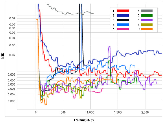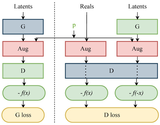 The concept of adaptive discriminator augmentation is supported by controlling the augmentation strength ‘p’ with which the augmentation is applied as the training progresses. The initial value of ‘p’ starts from 0 and is regulated every 4 mini-batches as training progresses. If overfitting occurs during the training, the p-value can be adjusted using a fixed rate. A given target value can control the strength of the p-value. This concept of setting a target value, i.e., “ADA target”, came from observing the training process and the safety limit of value ‘p’. For example, in the study by Karras et al. [20], it was observed that the FID value declined after ‘p’ became close to 0.5. Hence, the ADA target was set to 0.6. Regardless of the dataset volume, discriminator overfitting was avoided by implementing this strategy, and convergence was achieved during the training.