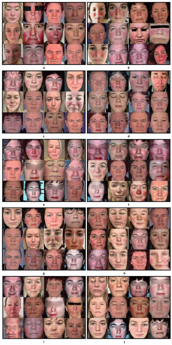 Rosacea is a chronic facial skin condition and a cutaneous vascular disorder that goes through a cycle of fading and relapse [8,9]. It is a common skin condition in native people from northern countries with fair skin or with Celtic origins [10]. Rosacea is often characterised by signs of facial flushing and redness, inflammatory papules and pustules, telangiectasias, and facial edema. The symptom severity varies greatly among individuals [11]. In the medical diagnostic approach, rosacea is classified into four subtypes—subtype 1 (Erythematotelangiectatic rosacea), subtype 2 (Papulopustular Rosacea), subtype 3 (Phymatous Rosacea), and subtype 4 (Ocular Rosacea). Each subtype may be further classified based on the severity of the condition, e.g., mild, moderate, or severe [9,12]. For this study, we considered subtype 1 and subtype 2, due to their progressive nature and tendency to intensify if remaining untreated, with subtype 1 often transitioning into subtype 2. This progression makes these subtypes particularly relevant for study. Additionally, other subtypes do not exhibit similar patterns in localized facial areas, which is crucial for our synthetic image generation process. Including other subtypes might hinder or mislead the generation, as they manifest differently on the face, thus not aligning with our study’s focus on localized symptom representation.