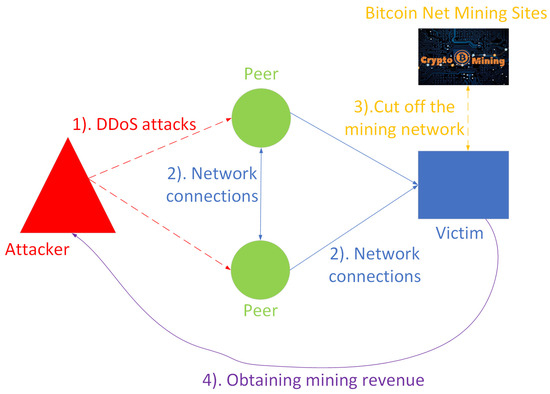 (4). After disconnecting the honest mining pools from the mining sites, the attackers use the malicious nodes under their control to launch DDoS attacks against the victims. The attacked victims lose a portion of their previous honest mining revenue. This portion of the earnings is transferred to the attackers through the blockchain network, and the attackers receive the proceeds of the attack.