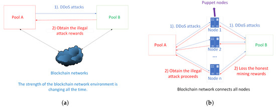 These methods can detect DDoS attacks or mitigate DDoS attacks in advance to a certain extent. However, these methods have some limitations and defects. First, DDoS detection methods can only detect the existence of DDoS attacks in advance. They cannot effectively mitigate the reduction in mining revenue from mining pools after a DDoS attack on a blockchain network. Second, the static game method can only fulfill the optimal strategy derived by mining pools against DDoS attacks within a single network environment. However, it cannot cater to the demands of an effective network environment in a complex and changing network environment. To illustrate this problem, we offer two DDoS revenue mitigation scenarios for complex environments. These two cases are illustrated in Figure 2. The first scenario in Figure 2a is mainly when a malicious mining pool attacks an honest mining pool through a blockchain network for illegal rewards. In this scenario, the network topology is not complicated, but the problems in the network environment will constantly change. How to model DDoS attack mitigation according to different intensity network environments is a complex problem. The second complex network situation in Figure 2b is that the malicious mining pool controls multiple puppet nodes in different network environments to attack the honest mining pool. The malicious mining pool is connected to puppet nodes to launch DDoS attacks against the honest mining pool to generate revenue. The network topology is complex. It is also a difficult problem to study how to mitigate the benefits of DDoS mining pools according to the change in the intensity of the network environment and the number of puppet nodes. Third, dynamic evolution and stochastic games can assist in implementing mining strategies that optimize the gains of mining pools against DDoS attacks within various network environments. Nevertheless, these techniques cannot address the effects and quantification of changing network conditions on the optimal game strategy and the optimal mining revenue.