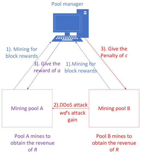 (1). means that pool A and pool B are both mining honestly, so they both obtain R. This DDoS attack scenario is illustrated in Figure 4.