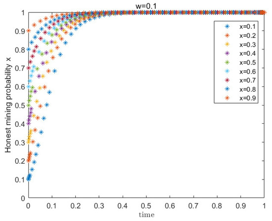 Our experiments are conducted using Matlab software on a laptop computer with Windows 11 and 16 GB of RAM. In our experiment, we simulated the situation where two mining pools in the blockchain network suffered from the revenue reduction of DDoS attacks. The specific settings of our experimental parameters are described in Table 6. From Table 6, we can obtain that the global parameters are the honest mining revenue R, the penalty c, the reward a, and the DDoS attack revenue d under an ideal network environment (). Then, we set specific global parameters to values , , , and . Also, we set the value range of w in three different network environments. We also set the value of the TSRG method to a based on the change in discount factor . Additionally, we set as the evolutionary experiment’s optimal strategy and as the repeated game’s strategy value. Finally, three sets of mining pool return data with delta values of 0.1, 0.4, and 0.8 were chosen for ANOVA experiments to determine if the variance of the returns is distributed according to the equilibrium of each set.