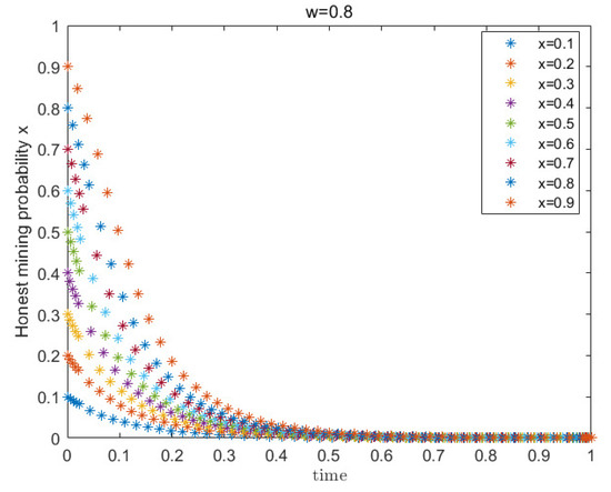 The experimental results of the probability change for the mixed strategy under the TSGR method are shown in Figure 15. We can see from the experimental results that the mixed strategy change in the TSRG method in this paper is independent of the value of the discount factor . Only the network environment coefficient w affects the mixed mining probability . In the experimental results, the X-axis represents w, the Y-axis represents , and the Z-axis represents the mining probability of the mixed strategy. When equals 0, it is the case of a single honest mining or DDoS attack pure strategy, not the case of a mixed strategy with multiple mining strategies. We can obtain that the change in follows Equation (3). The mixed mining probability decreases inversely with the increase in the network environment coefficient w. This indicates that the honest mining probability of the mining pool decreases with the improvement in the network environment in the medium network environment. Therefore, mining pools gradually have a higher probability of using mixed strategies to select DDoS attacks for optimal returns.