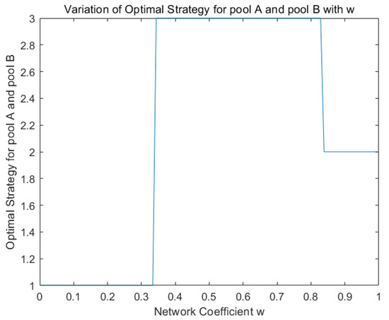 We analyze the impact of the network environment fetch range on the selection of optimal policy choices for mining pools to defend against DDoS attacks using the payoff table in Table 5. We divide the value range of network environment coefficient w into three parts by the attack strategy of pool A and pool B by the SPE method [35]. We discuss the values of different network environments, the optimal strategy, and the utility of mining pools in three cases. Each network situation is a subgame. The perfect equilibrium strategy to solve the subgame is to solve the optimal strategy and payoff of the mining pool. Also, we solve the value of w and solve the optimal mining strategy, honest mining probability, and optimal mining revenue under different values of w. The analysis and derivation presented below reveal the precise network environment coefficients, optimal strategies for diverse network environments, mining probabilities, and optimal returns. References to subgame perfect equilibrium theory are used in the computation of our Equations ([35,36]).