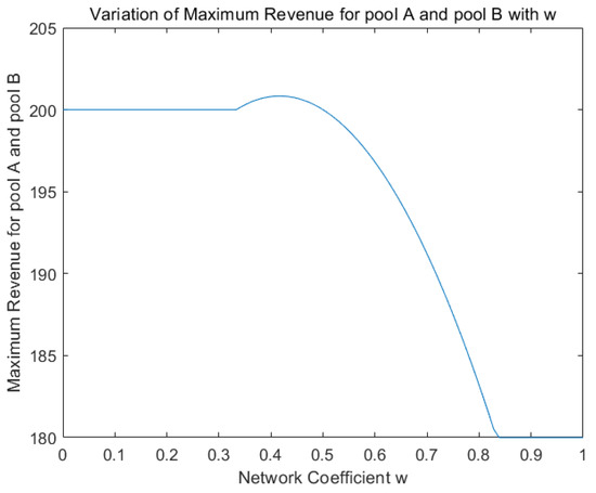 From Equation (2), we can conclude that the right side of the inequality is the optimal return for a given mining pool as network conditions improve, and the left side of the inequality is the value that is closest to the optimal return. A range of values for the network environment goodness factor is obtained by solving the inequality in this manner. According to Equation (2) and the game model in Section 3, we can determine the network environment coefficient w for mining pool A and mining pool B to select an optimal DDoS attack strategy for maximum profit, with a requirement that . According to the value of w in Equation (2), we can obtain that w is in a situation where the value is relatively large, indicating that both mining pool A and mining pool B will choose the strategy to obtain the optimal returns under a good network condition. We define as the best revenue in good networks for pools. Therefore, mining pools choose as the strategy that is profitably optimal. Also, pool A and pool B both have an optimal return of .