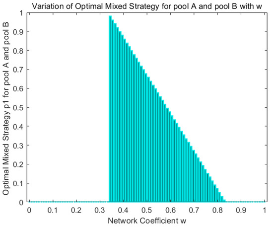 (3). When the value of the network environment coefficient w is , mining pools A and B have the best profit when multiple strategy choices exist simultaneously, called a mixed strategy state. Then, we know that the network environment is currently in a medium environment from the value of w. We must calculate the probability of honest mining and optimal mining returns using a mixed strategy when the mining pool is under a DDoS attack in a mid-network environment. Also, we assume that the probability of honest mining using a pool mix strategy in our model is . Then, both pool A and pool B are mining pools with equivalent computing power, resulting in an identical honest mining probability of . The predicted gain for mining honestly in a mining pool equals the predicted gain for carrying out a DDoS attack. Based on the equivalent expected payout analysis, we present the probability for a mining pool to engage in honest mining under a mixed strategy utilizing Equation (3).
