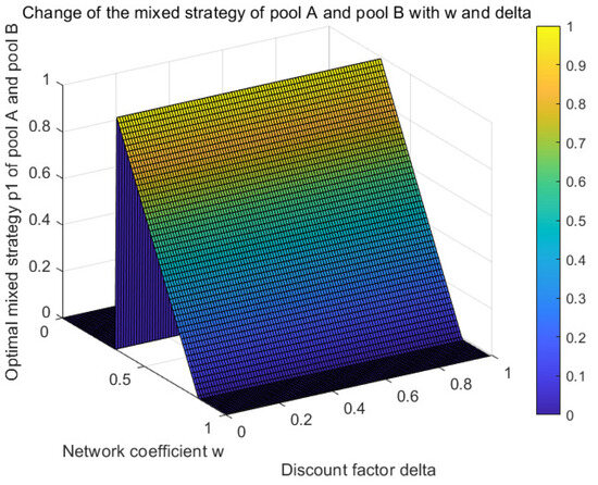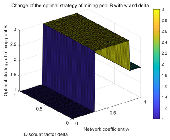 After setting the parameters, we realized the experiment of the optimal strategy change for mining pools under infinitely repeated games. The specific experimental results are shown in Figure 14. We can see from the experimental results that the x-axis represents the network environment coefficient w, the y-axis represents the discount factor , and the z-axis represents the mining strategy. The optimal strategy of the mining pool changes only with w, not with the discount factor . Therefore, the result of optimal strategy selection in the infinite repeated game mining pool is the same as the result of the SPE strategy change experiment in Section 4.2.1 above. The network environment is in a bad state when w increases from 0 to nearly . In this case, pool A and pool B choose the best honest mining strategy. When the value of w changes from about to about , the mining pools in a medium network condition all choose the mixed mining strategy to make the best profit. When w changes from about to 1, mining pools decide to launch DDoS attacks against each other in a good network environment to obtain the best returns. The selection of the optimal strategy of the infinite repeated game mining pool is consistent with the results of the evolutionary game experiment in Section 4.1 and the SPE experiment in Section 4.2.1. At the same time, the experimental results in this section are consistent with the theoretical results of the TSRG method in Section 3.3. This shows the correctness of our method and experiment.