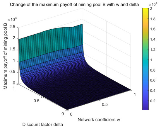 The mining profit experiment in infinite repeated game times is an experiment to realize the change in optimal profit for a mining pool with the network environment by the TSRG method. Our experimental results are shown in Figure 16. From Figure 16, we can see that the X-axis represents the network environment coefficient w, the Y-axis represents the discount factor , and the Z-axis represents the optimal returns under different network environments. The different colored curves in Figure 16 represent the values of the mining pool returns, which are constantly changing with the discount . If the value of the discount factor is unchanged, we can see that the revenue of the mining pool first tends to stabilize with the increase in the network environment coefficient w. When w is approximately 0.33, the revenue of the mining pool first increases and then decreases. Finally, when w is about 0.83, the revenue of the mining pool drops to the lowest value and does not change. If w is constant, the discount factor increases and the income of the mining pool gradually increases. The reasons for this experimental result are as follows: First, as w changes from 0 to about 0.33, the mining pool is in a bad network environment. The change in the value of the pool returns follows the value of in Equation (6). The optimal profit of the mining pool remains equal to the value of without changing. When w is approximately between 0.33 and 0.83, the mining pool is in a medium network environment. The optimal revenue of the mining pool follows Equation (8). We can see through Equation (8) that is constant with the optimal return of the mining pool alongside w into a quadratic equation relationship. The optimal revenue of the mining pool first increases to a maximum value with the increase in the network environment w, and then gradually decreases from the maximum value. When w changes from about 0.83 to 1, the mining pool is in a good network condition. The returns of the mining pool in this case follow Equation (7). The optimal gain for the mining pools in this case is consistent with the gain from launching DDoS attacks against each other, which is less than the gain in any other case. Second, from Equations (6)–(8) we can obtain that the value of the discount factor is proportional to the mining revenue. The higher the discount factor , the higher the mining revenue. The discount factor mainly refers to the fact that we are extrapolating future returns to present returns. Thus, the higher the discount factor, the more future returns we obtain when calculating the optimal returns we obtain now, and the higher the returns we obtain for infinite games. Our designed TSRG method achieves the best earnings value by taking into account the discount factor delta. A lower value leads to less future earnings being converted to current earnings and a lower optimal earnings value.