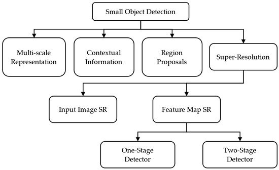 Hierarchical diagram of the related works: Small Object Detection [11]; Multi-scale Representation [4,27,28,29,30]; Contextual Information [31,32]; Region Proposals [34,35]; Input Image SR [14,15,16,17,19,20,21,22,23]; One-stage Detector (Proposed Method); Two-stage Detector [24,25,26].