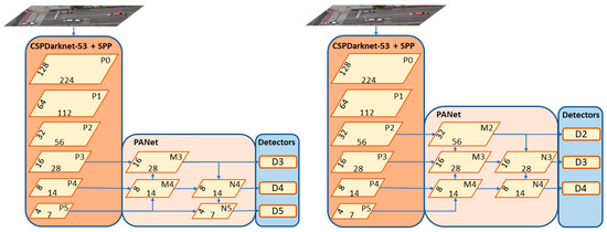 Architectures of YOLOv4 (left) and YOLOv4-HR (right).
