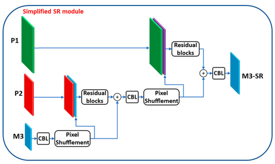 The backbone CSPDarknet53 of YOLOv4 still has a higher-resolution feature map P1, which is not utilized to enhance performance. This feature map contains shallow information with a lot of noise but critical detailed information about small objects which is intensively filtered out during convolutions to high-level feature maps. With the help of the feature map P1, we can detect small objects in low-resolution images even better. Drawing inspiration from the FTT module as well as the super-resolution network SRGAN [37], which upscales the image twice and super-resolves the resolution four times larger, we propose an SR module that even makes use of feature map P1. This module is superior to the FTT module and powerfully enhances the feature map to obtain the capability of detecting small and tiny objects. The proposed SR module is illustrated in Figure 4.