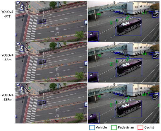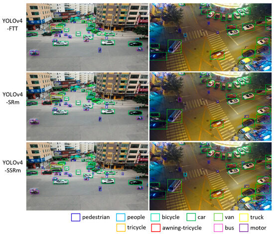 Table 3 shows the detection performance on the VisDrone2019 test set. The same performance tendency as in Table 2 can also be found in this table, even though the performance of all methods are lower than those of Table 2 because the VisDrone2019 dataset is much more challenging than the self-built dataset. The results in Table 2 and Table 3 clearly show the SR modules play vital roles in one-stage detectors for finding small objects because they can generate high-resolution feature maps that focus more on gaining information about small objects. Figure 8 and Figure 9 illustrate the example detection results of the proposed networks (YOLOv4-FTT, YOLOv4-SRm, and YOLOv4-SSRm) on the self-built and VisDrone2019 datasets, respectively. In these figures, it can be noticed that the proposed methods precisely detect small objects as well as objects of other sizes. In particular, they could correctly predict and distinguish between similar instances (pedestrian and cyclist in the self-built dataset and people and pedestrian in the VisDrone2019 dataset).