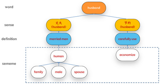 Sememe annotations of the word “husband” in HowNet. Each sense corresponds to a distinct definition of the word and is further annotated with a set of sememes, which serve to express its underlying semantics.