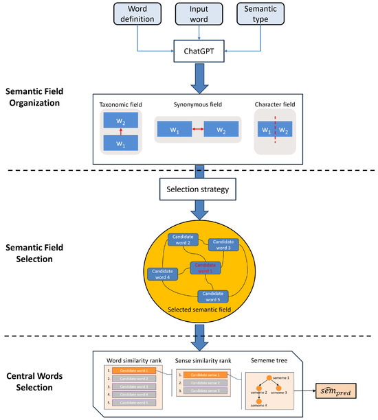 As illustrated in Figure 2, our method consists of three main steps: semantic field organization (Section 3.1), semantic field selection (Section 3.2), and central word selection (Section 3.3). Initially, specific information is inputted into ChatGPT to generate three types of semantic fields. Subsequently, an optimal semantic field is chosen using a devised strategy. Within the selected semantic field, the similarity is computed in the order of word–sense–sememe, and the word with the highest average similarity is identified as the central word. The sememes of this central word serve as the prediction result.