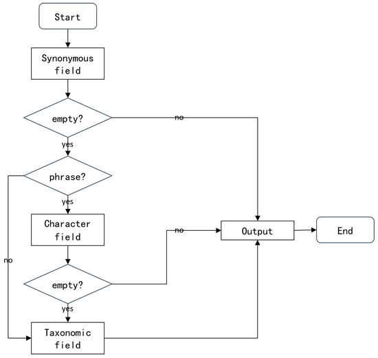 Based on these conclusions, we formulated the following semantic field selection strategy as shown in Figure 4: first, we searched for the central word in the synonymous field. If the synonymous field for that word was an empty set, then we proceeded to search for the best sense in the character field. If the character field was also an empty set, then we finally searched for the central word in the taxonomic field.