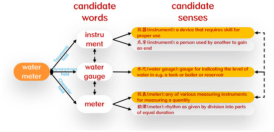 As shown in Figure 5, the candidate words of “water meter” include “instrument”, “water gauge”, and “meter.” Senses of the same word may have significantly different definitions. For example, the sense of “instrument” includes “仪器 (instrument)”, “爪牙 (instrument)”, etc. Clearly, not all of these senses belong to the semantic fields of their respective words. For the sense “仪器 (instrument)”, we can find the semantically related senses “水尺 (water gauge)” and “仪表 (meter)” in the other two words, while there is no semantically related sense for the sense “爪牙 (instrument).” Therefore, the sense “仪器 (instrument)” should belong to the semantic fields of its respective words.