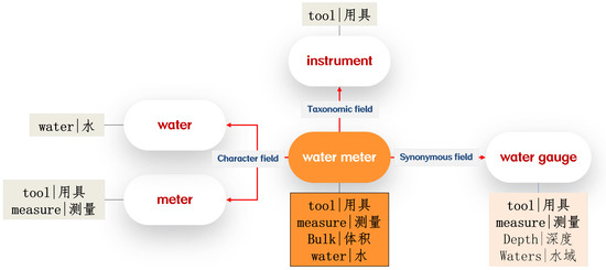 Figure 8 illustrates the sememe set of “water meter” and its synonyms, hypernyms, and split characters. In the case of “water meter”, its near words in the taxonomic field, synonymous field, and character field exhibit some similarity in their sememe sets because there exists a certain level of semantic correlation between these semantic fields and the target words.