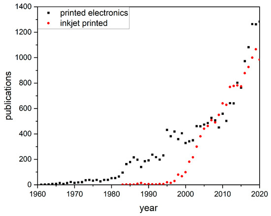 Printed electronics combine many areas of technological research, which may include (micro)electronics, chemistry, and printing. Literature reviews on this subject show a growing interest in this field, which is evidenced by an increasing number of publications that appear in various scientific databases year by year (Figure 1). Analysis of Figure 1 shows that especially after year 2000, the number of published papers with the keywords ‘printed electronics’ or ‘inkjet printing’ has demonstrated a sharply increasing trend.
