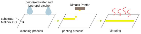 A schematic view of the manufacturing process using inkjet printing applied in this study is presented in Figure 3. A Melinex OD foil (DuPont Teijin Films, Contern, Luxemburg) with a thickness of 125 μm was used as a substrate. The most important film parameters are the elongation at break (125%), the total luminous transmission (89.5%), and the dielectric strength (125 kV/mm) [36]. Amepox Nano Ink AX JP-60n (Amepox, Konstantynów Łódzki, Poland) ink was chosen as the printing ink. The samples were printed using a Dimatix 2831 printer (from Fujifilm Dimatix, Santa Clara, CA, USA) and a 10 pL print head. A Binder GmbH (Tuttlingen, Germany) convection oven was used for sintering the structures. A Hewlett Packard 4263A LCR (Hewlett-Packard Company, Palo Alto, CA, USA) meter was used for electrical measurement, and a Carl Zeiss Axio Vision microscope (Carl Zeiss, Jena, Germany) and AxioVision software (version 4.5, Carl Zeiss, Jena, Germany) was used for optical observation. For the ageing tests, a Binder MKF-115 (Tuttlingen, Germany) climate chamber was used.