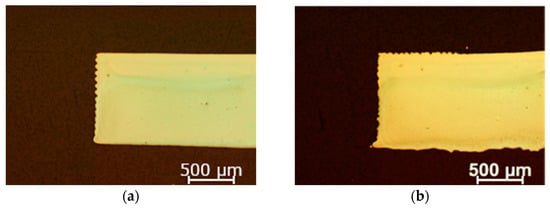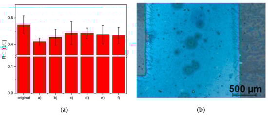 Analysis of the quality of the conductive layers and the performance of ageing tests made it possible to identify the factors that affect the deterioration of electrical parameters by performing tests in a climate chamber using different temperatures, humidity, and combinations of these parameters. The tests showed that the change in resistance was most influenced by the cyclic change in temperature, as shown in Figure 12a, which shows discoloration, indicating oxidation of the applied layer, while the edges show clear cracks. They contributed to changes in the electrical parameters of the analyzed structures. An explanation of the observed effect of lowering the resistance value could be absorption of moisture (water) during tests in a climate chamber. The absorption of water caused an increase in volume, resulting in micro-cracks in the structure, especially at the edges, where the height of the layer is much bigger due to the coffee ring effect that occurs. Such an effect also indicates the necessity of aging the fabricated structures according to a specific temperature profile, especially when the printed conductive path will be a component of a larger electronic component operating under varying atmospheric conditions. In addition, structures made with the inkjet printing technology should be protected from moisture and rapid temperature changes.