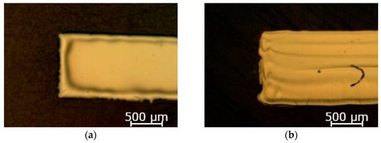 Another important parameter from the point of view of the quality of printed layers is the height of the head above the substrate level. If it is too high, it does not maintain the desired shape, because there is waviness on the edge, and unwanted droplets form as a result of ink splashing on the substrate. If the height is too low, it can result in jamming of the carriage with the table cartridge. Additionally, this can result in the smearing of the pattern as a result of the movement of the carriage. The height of the head must be selected for the rheology of the ink ejected from the cartridge [38]. In the case of the Fujifilm Dimatix Materials Printer DMP-2831, the height of the carriage above the printer table can be up to 25 mm. During the tests, the parameter was changed from 50 μm to 1500 μm (up to 600 μm in 50 μm increments, and from 600 μm upwards in 100 μm increments) over the height of the Melinex OD film on the substrate (not the printer table). With further increase in the droplet spacing, the pattern became less and less distinct, and there was more splatter of material around the desired shape. Exemplary microscopic images of silver lines printed at different heights of the cartridge above the substrates are shown in Figure 5. As can be seen in the figure, the shape of the print surface and edge depends on the height. The research conducted indicated that the optimal cartridge height is 50 µm.