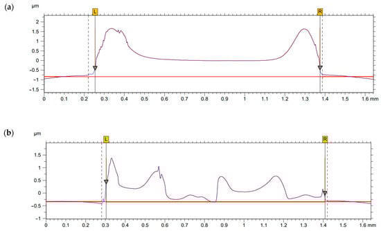 Profilogram of lines prepared using different table temperatures: (a) 30 °C and (b) 60 °C.