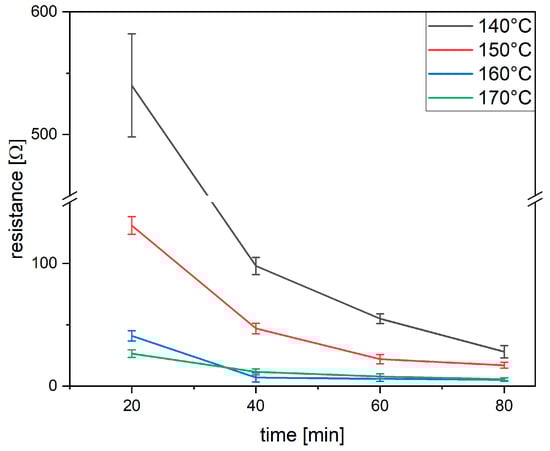 The quantitative parameter which was chosen for investigations of the influence of sintering temperature and time on the printed silver lines quality was electrical resistance. The results of the resistance measurements are collected in Table 2. The high resistance value seen in Figure 8 at the initial stage of the process indicates that no sintering process has occurred between the individual molecules of silver, the base component of the ink. By increasing the sintering temperature, it is possible to observe a decrease in resistance, and therefore an increase in conductivity, which is the result of the occurrence of diffusion processes that result in the formation of neck connections. This results in an increase in the contact area between the nanoparticles. The diffusion processes that occur between the particles cause the pores to close, and after a sufficiently long period, the pores disappear from the structure, resulting in low resistance. Importantly, the longer the sintering process time and the higher the temperature, the lower the final resistance value. A lower sintering temperature prolongs the process of stabilizing the resistance value.