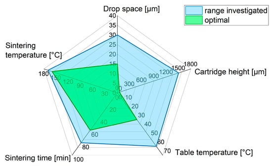 In Figure 9, the analyzed (range investigated) parameters are shown, and the optimal values of the studied quantities are indicated. Thus, it can be read that the best optical-geometric values are obtained by printing with a drop space of 15 µm, a table temperature of 30 °C, and a head height of 50 µm. The best electrical parameters are influenced by sintering time and temperature. The tests performed indicated that the process should be carried out at 160 °C for 60 min.