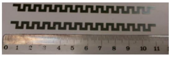 Ageing tests allowed us to determine the influence of humidity and temperature on electrical parameters. The fabricated samples (Figure 10), printed according to the optimal parameters described (drop space 15 μm; table temperature 30 °C, sintering 160 °C/60 min), were continuously subjected to a series of reliability tests in a Binder MKF 115 climate chamber for 125 h. The samples under different conditions were analyzed by changing the temperature and humidity using a combination of these parameters. A total of six different configurations were used, and are denoted by letters a–f, presented in Table 3.