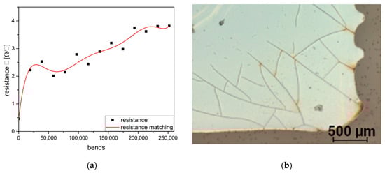 (a) Resistance change during the bending and straightening process; (b) microscopic image showing changes in the structure after bending tests.