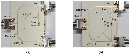 - Deng, P.-H.; Dai, L.-C. Unequal Wilkinson Power Dividers with Favorable Selectivity and High-Isolation Using Coupled-Line Filter Transformers. IEEE Trans. Microw. Theory Tech. 2012, 60, 1520–1529. [Google Scholar] [CrossRef]