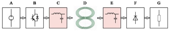 The structure of the wireless power transmission system is depicted in Figure 2. In Figure 2, block A represents the DC power supply; block B represents the inverter circuit; block C and block E are compensation networks [20]; block D is a mutual inductance coil, which is a device for power transmission; block F is a rectifier circuit; and block G represents the electrical equipment.